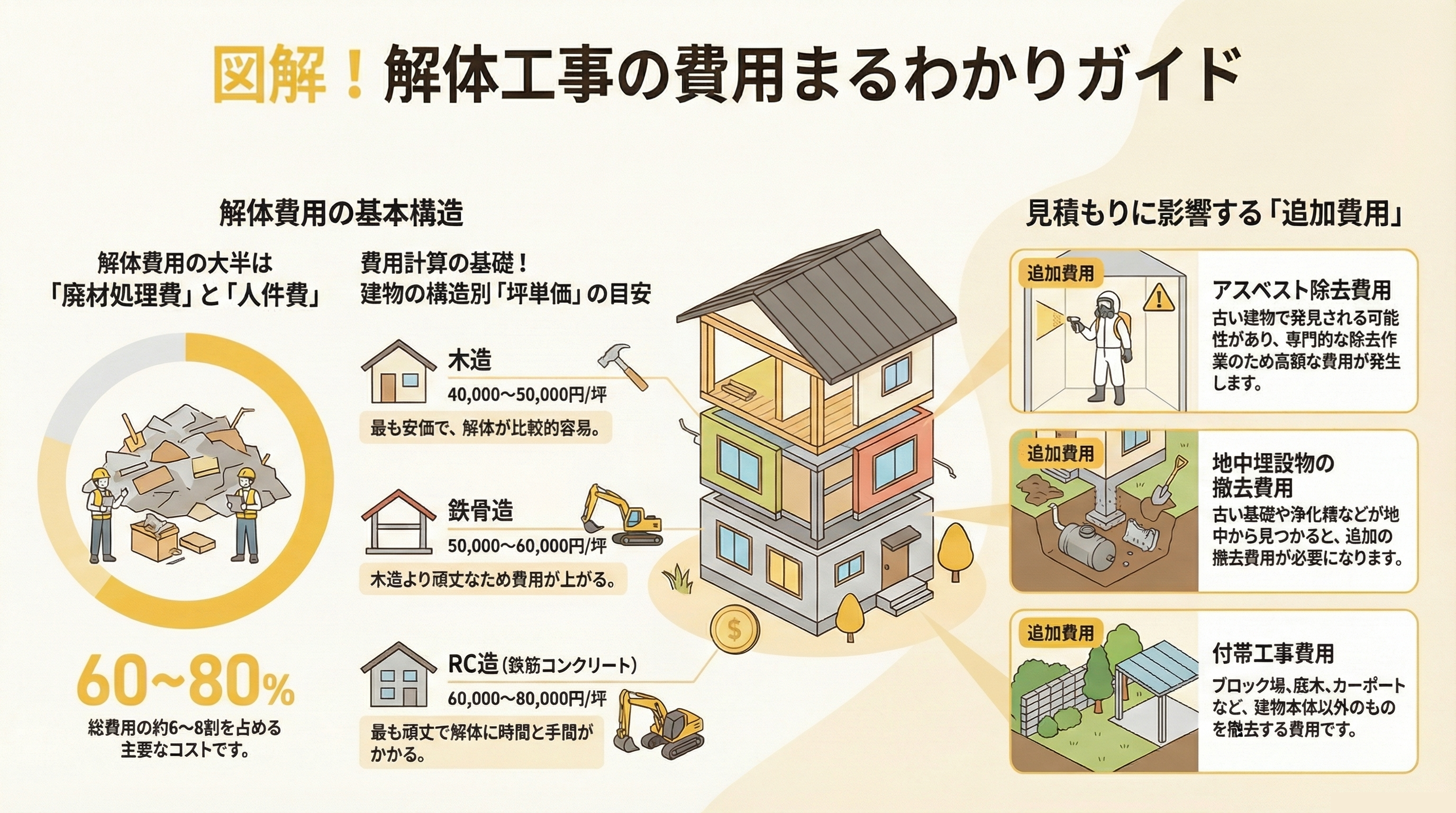 建物の頑丈さに比例して、「壊す手間(人件費)」と「ゴミの重さ(処分費)」が増えるため、坪単価が高くなります。