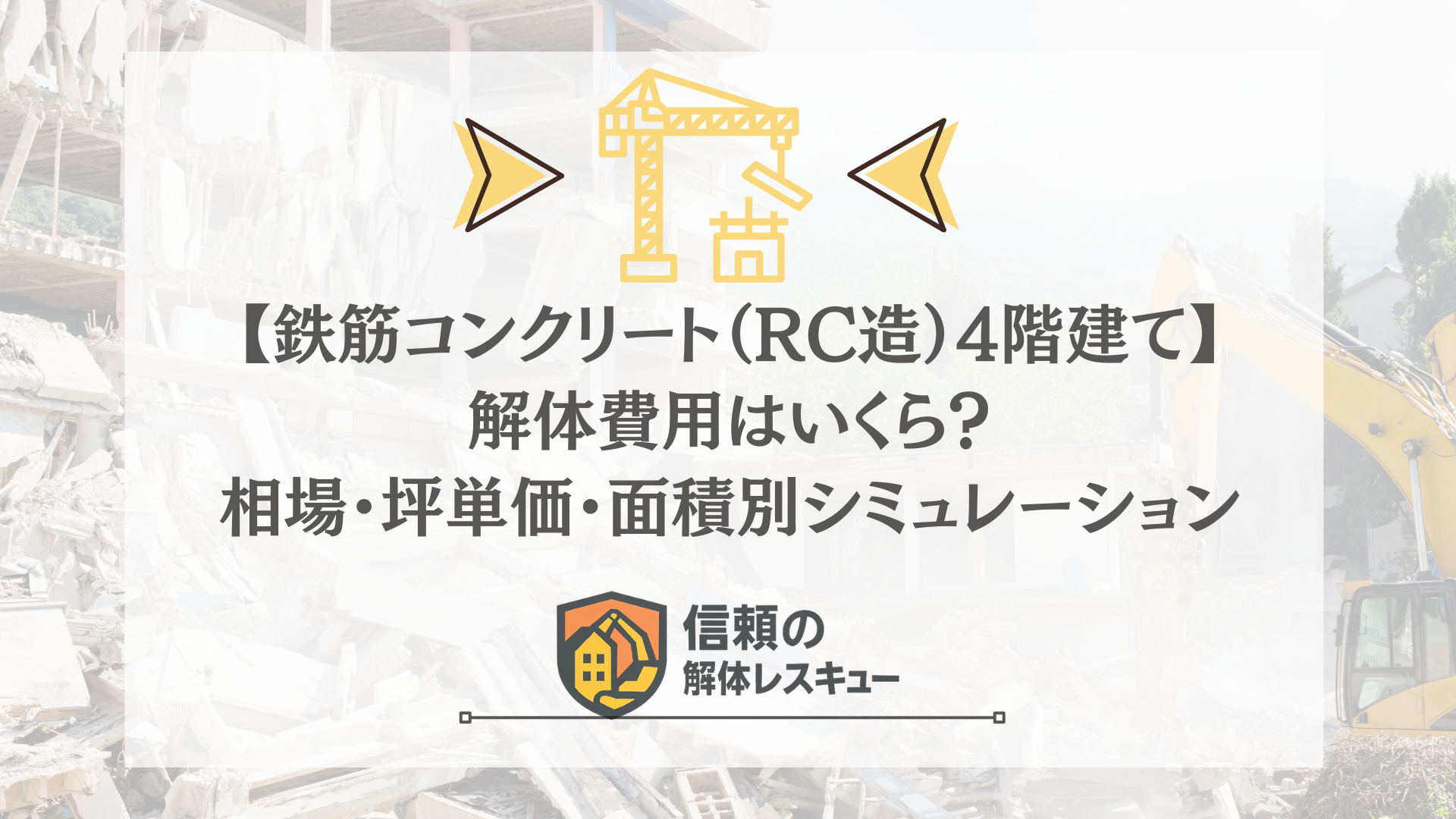 鉄筋コンクリート(RC造)4階建ての解体費用は、坪単価7万円~11万円が相場です。ただしこれはあくまで目安であり、総額は建物の面積や立地、設備の有無で大きく変動します。特に4階建て以上では高所作業に伴うコストが加わるため、単純な坪単価計算だけでなく、複合的な要因を考慮することが、正確な費用感を掴むための鍵となります。