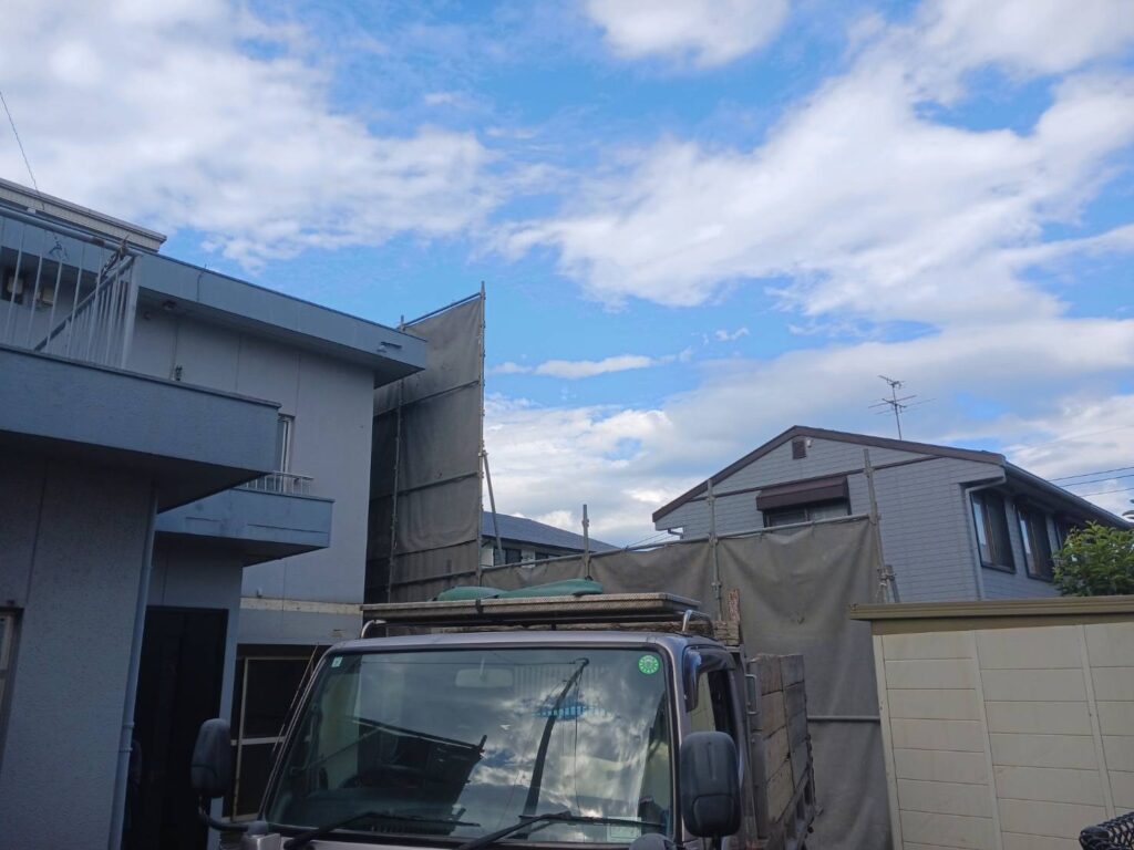 次に、建物周囲に足場と防音・防塵シートを設置します。
