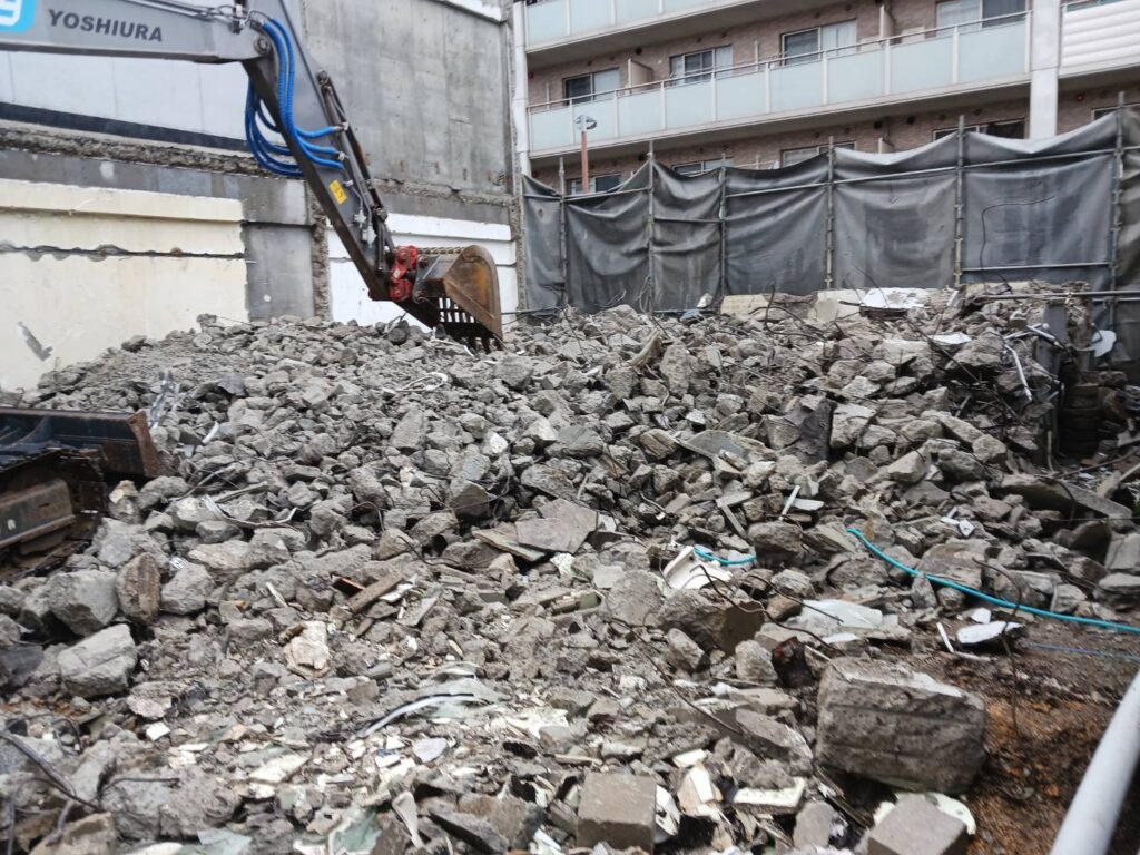 躯体解体後は、発生したコンクリートガラや鉄筋を集積し、分別します。