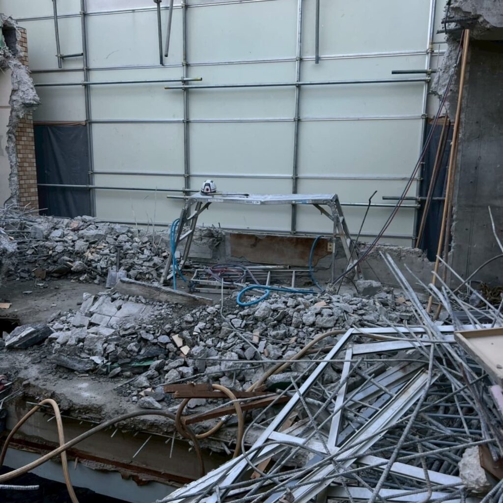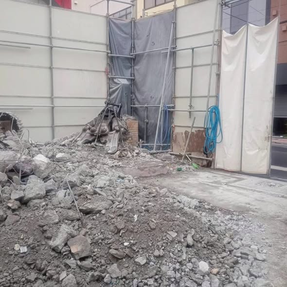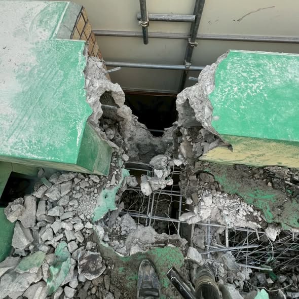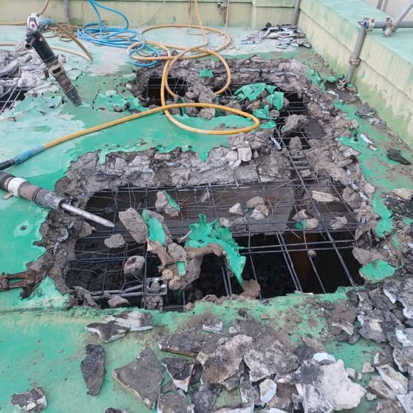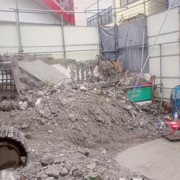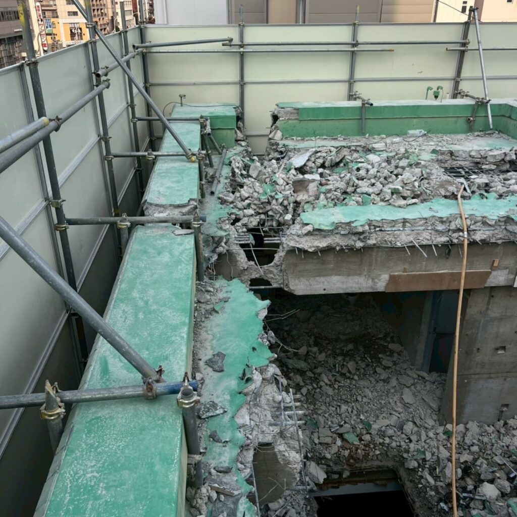 ガソリンスタンド解体では、屋上〜上階を段階的に減らしていきます。主役は「はつり」と「鉄筋切断」です。