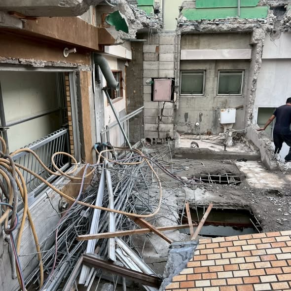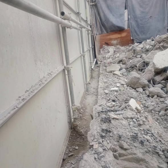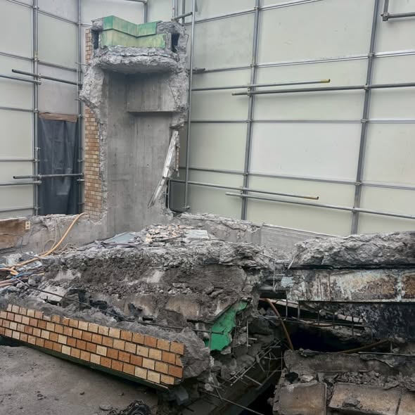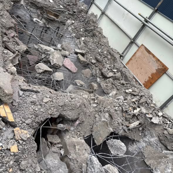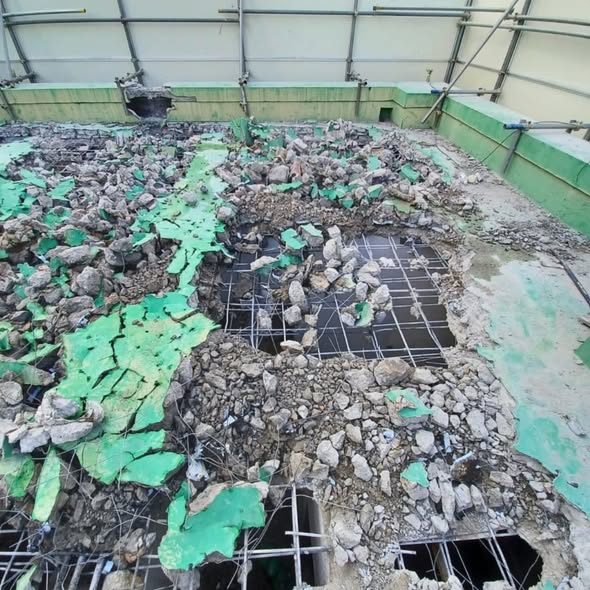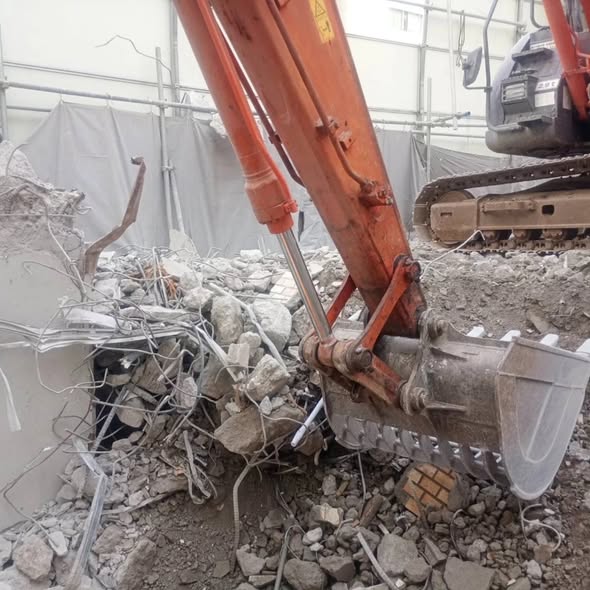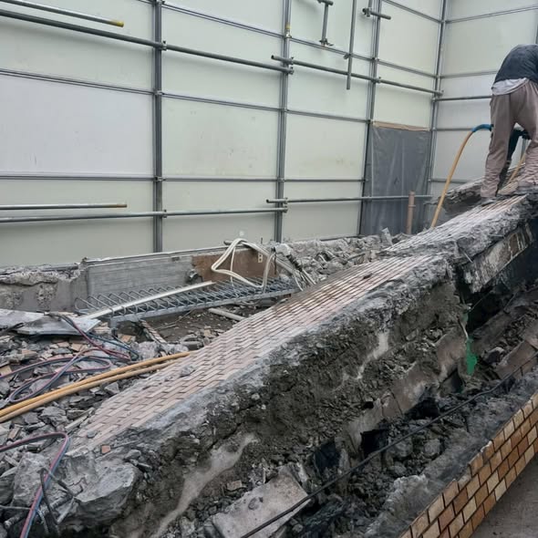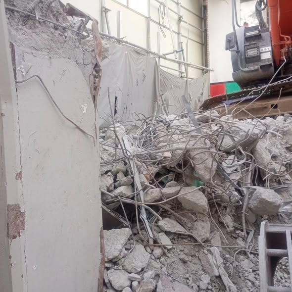 ガソリンスタンド解体では、屋上〜上階を段階的に減らしていきます。主役は「はつり」と「鉄筋切断」です。