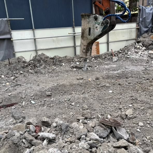 土間コンクリートを破砕して撤去し、地下構造物(タンク等)へアクセスする準備を進めます。