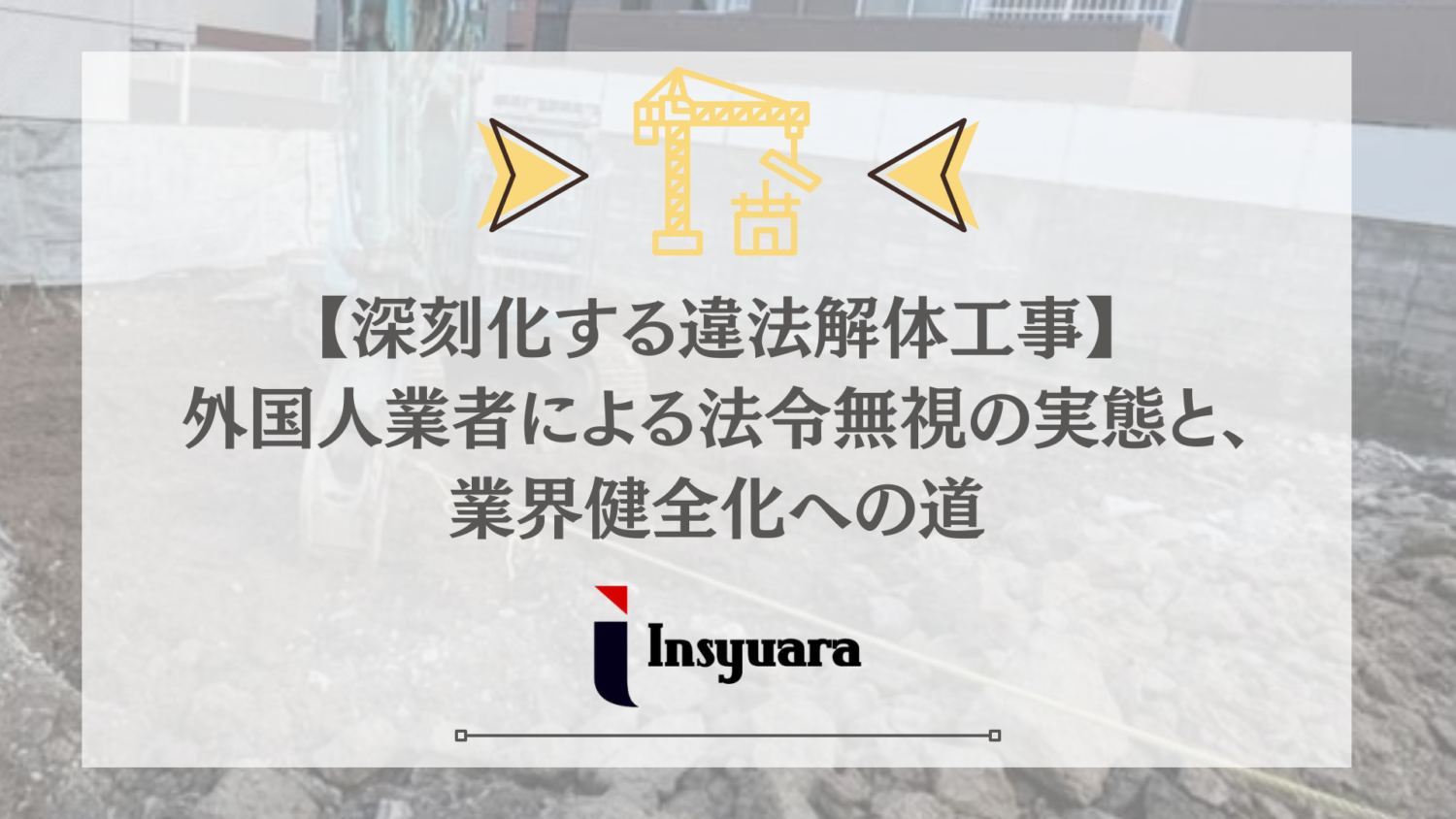 解体工事は、建物を壊すだけの仕事ではありません。安全を確保し、環境を守り、法令を遵守して初めて「適正な解体工事」と言えます。問題の本質は、国籍ではなく「法律を守るか守らないか」です。 違法行為を行う業者を業界から排除し、真面目に法令を遵守している業者が正当に評価される業界を実現することがインシュアラの使命です。